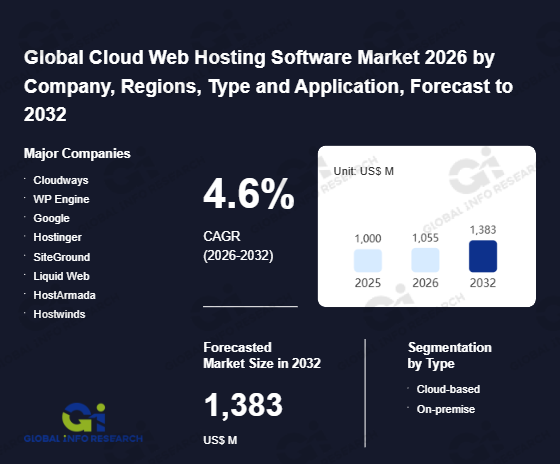 Global Info Research has recently published "Global Cloud Web Hosting Software Market 2026 by Manufacturers, Regions, Type and Application, Forecast to 2032". This report systematically analyzes the global Cloud Web Hosting Software market, providing multi-dimensional insights through type (Cloud-based、 On-premise), application (Large Enterprises、 SMEs), regional markets, and major manufacturers (Cloudways、 WP Engine、 Google、 Hostinger、 SiteGround、 Liquid Web、 HostArmada、 Hostwinds、 DreamHost、 AccuWeb Hosting、 ChemiCloud、 Liquid Web、 Softxaa、 Hetzner、 InMotion Hosting、 NameHero、 Crazy Domains、 FastComet、 Gatsby Cloud、 Hostingli、 HOSTPRO), assessing the market status, trend evolution, and competitive landscape impact from 2021 to 2032.