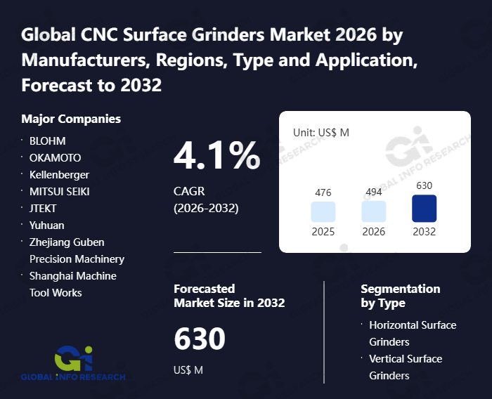 Global Info Research has recently published "Global CNC Surface Grinders Market 2026 by Manufacturers, Regions, Type and Application, Forecast to 2032". This report systematically analyzes the global CNC Surface Grinders market, providing multi-dimensional insights through type (Horizontal Surface Grinders、 Vertical Surface Grinders), application (Automotive、 Aerospace、 Mechanical Manufacturing、 Others), regional markets, and major manufacturers (BLOHM、 OKAMOTO、 Kellenberger、 MITSUI SEIKI、 JTEKT、 Yuhuan、 Zhejiang Guben Precision Machinery、 Shanghai Machine Tool Works), assessing the market status, trend evolution, and competitive landscape impact from 2021 to 2032.
