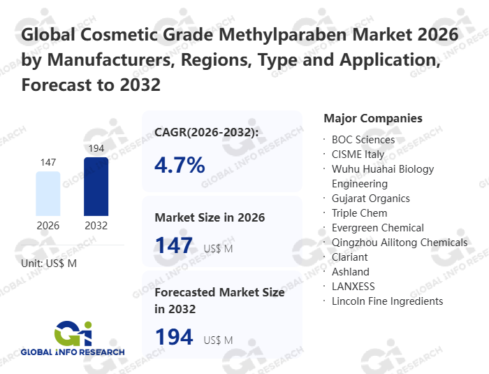 Global Info Research has recently published "Global Cosmetic Grade Methylparaben Market 2026 by Manufacturers, Regions, Type and Application, Forecast to 2032". This report systematically analyzes the global Cosmetic Grade Methylparaben market, providing multi-dimensional insights through type (Content ≤99%、 Content >99%), application (Skin Care Products、 Hair Care Products、 Makeup Products), regional markets, and major manufacturers (BOC Sciences、 CISME Italy、 Wuhu Huahai Biology Engineering、 Gujarat Organics、 Triple Chem、 Evergreen Chemical、 Qingzhou Ailitong Chemicals、 Clariant、 Ashland、 LANXESS、 Lincoln Fine Ingredients、 Sharon Personal Care、 Hallstar), assessing the market status, trend evolution, and competitive landscape impact from 2021 to 2032.
