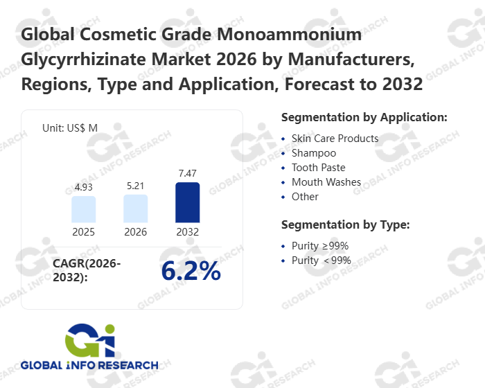 Global Info Research has recently published "Global Cosmetic Grade Monoammonium Glycyrrhizinate Market 2026 by Manufacturers, Regions, Type and Application, Forecast to 2032". This report systematically analyzes the global Cosmetic Grade Monoammonium Glycyrrhizinate market, providing multi-dimensional insights through type (Purity ≥99%、 Purity <99%), application (Skin Care Products、 Shampoo、 Tooth Paste、 Mouth Washes、 Other), regional markets, and major manufacturers (VITAL-CHEM Zhuhai、 Sabinsa、 Alchem International、 Shaanxi Fujie Pharmaceutical、 MAFCO Worldwide、 Alps Pharmaceutical、 BGG World、 Qingdao Taitong Pharmaceutical、 Cokey、 Jiangsu Tiansheng Pharmaceutical、 Shaanxi Jintai Biological Engineering、 Qinghai Lake Pharmaceutical、 VITAL-CHEM Zhuhai、 Shaanxi Fujie Pharmaceutical、 Qingdao Taitong Pharmaceutical), assessing the market status, trend evolution, and competitive landscape impact from 2021 to 2032.