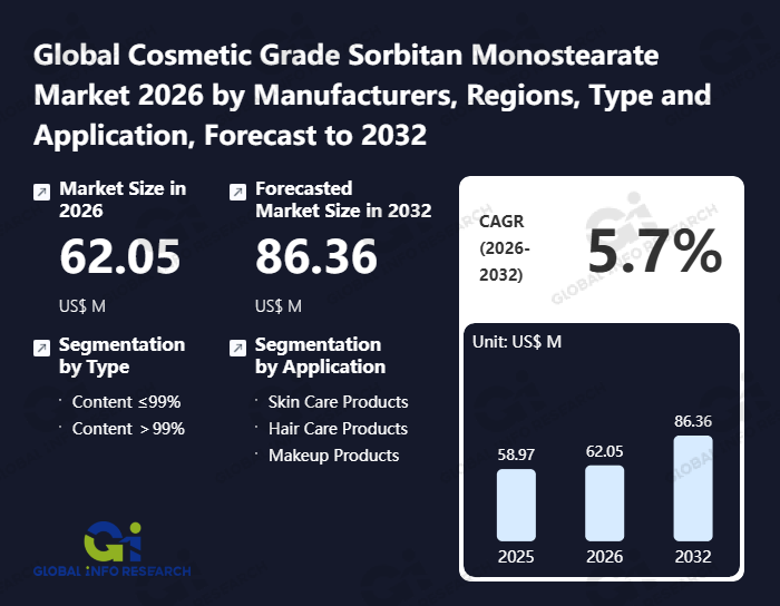 Global Info Research has recently published "Global Cosmetic Grade Sorbitan Monostearate Market 2026 by Manufacturers, Regions, Type and Application, Forecast to 2032". This report systematically analyzes the global Cosmetic Grade Sorbitan Monostearate market, providing multi-dimensional insights through type (Content ≤99%、 Content >99%), application (Skin Care Products、 Hair Care Products、 Makeup Products), regional markets, and major manufacturers (Mohini Organics、 Hangzhou Fuchun Food Additive、 Croda、 Guangzhou Runhua Food Additive、 Triveni Chemicals、 Jeevika Yugchem、 Kao Chemicals), assessing the market status, trend evolution, and competitive landscape impact from 2021 to 2032.