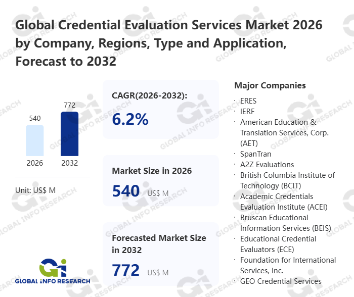 Global Info Research has recently published "Global Credential Evaluation Services Market 2026 by Manufacturers, Regions, Type and Application, Forecast to 2032". This report systematically analyzes the current status, future trends (2021-2032), and competitive landscape of the global Credential Evaluation Services market. It provides a quantitative analysis from the perspectives of type (General Evaluation、 Course-by-Course Evaluation、 Others), application (Employment、 Immigration、 Education、 Others), regional markets, and major manufacturers (ERES、 IERF、 American Education & Translation Services, Corp. (AET)、 SpanTran、 A2Z Evaluations、 British Columbia Institute of Technology (BCIT)、 Academic Credentials Evaluation Institute (ACEI)、 Bruscan Educational Information Services (BEIS)、 Educational Credential Evaluators (ECE)、 Foundation for International Services, Inc.、 GEO Credential Services、 International Evaluations、 SpanTran: The Evaluation Company、 World Education Services (WES)), comprehensively assessing market opportunities and competitive dynamics.