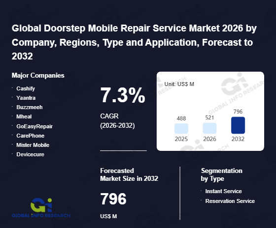 Global Info Research has recently published "Global Doorstep Mobile Repair Service Market 2026 by Manufacturers, Regions, Type and Application, Forecast to 2032". This report systematically analyzes the global Doorstep Mobile Repair Service market, providing multi-dimensional insights through type (Instant Service、 Reservation Service), application (Battery Repair and Replacement、 Screen Repair and Replacement、 Camera Repair and Replacement、 Others), regional markets, and major manufacturers (Cashify、 Yaantra、 Buzzmeeh、 Mheal、 GoEasyRepair、 CarePhone、 Mister Mobile、 Devicecure、 Gadset、 Spazeme、 Fixerman、 MobiPoint、 Fix Screen Repair、 TutaScreen、 Jikexiu、 Suddenfix), assessing the market status, trend evolution, and competitive landscape impact from 2021 to 2032.
