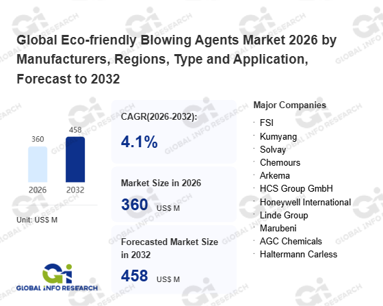 Global Info Research has recently published "Global Eco-friendly Blowing Agents Market 2026 by Manufacturers, Regions, Type and Application, Forecast to 2032". This report systematically analyzes the current status, future trends (2021-2032), and competitive landscape of the global Eco-friendly Blowing Agents market. It provides a quantitative analysis from the perspectives of type (Chemical Foaming Agent、 Physical Blowing Agent、 Surfactant), application (Building and Construction、 Electrical and Electronics、 Furniture and Bedding、 Automotive、 Footwear、 Others), regional markets, and major manufacturers (FSI、 Kumyang、 Solvay、 Chemours、 Arkema、 HCS Group GmbH、 Honeywell International、 Linde Group、 Marubeni、 AGC Chemicals、 Haltermann Carless、 Messer、 Nouryon、 Dupont、 Evonik、 Guangzhou Yourun Synthetic Materials、 Jiangsu Masyta Chemical), comprehensively assessing market opportunities and competitive dynamics.