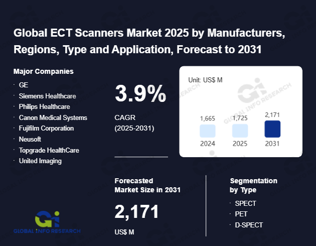 Global Info Research has recently published "Global ECT Scanners Market 2026 by Manufacturers, Regions, Type and Application, Forecast to 2032". This report systematically analyzes the current status, future trends (2021-2032), and competitive landscape of the global ECT Scanners market. It provides a quantitative analysis from the perspectives of type (SPECT、 PET、 D-SPECT), application (Oncology、 Cardiology、 Neurology、 Other), regional markets, and major manufacturers (GE、 Siemens Healthcare、 Philips Healthcare、 Canon Medical Systems、 Fujifilm Corporation、 Neusoft、 Topgrade HealthCare、 United Imaging、 Mediso), comprehensively assessing market opportunities and competitive dynamics.