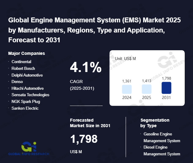Global Info Research has recently published "Global Engine Management System (EMS) Market 2026 by Manufacturers, Regions, Type and Application, Forecast to 2032". This report systematically analyzes the current status, future trends (2021-2032), and competitive landscape of the global Engine Management System (EMS) market. It provides a quantitative analysis from the perspectives of type (Gasoline Engine Management System、 Diesel Engine Management System), application (Passenger Vehicle、 Light Commercial Vehicle、 Heavy Commercial Vehicle), regional markets, and major manufacturers (Continental、 Robert Bosch、 Delphi Automotive、 Denso、 Hitachi Automotive、 Sensata Technologies、 NGK Spark Plug、 Sanken Electric、 Hella KgaA Hueck、 Haltech Engine Management Systems、 M-Tech Automotive、 Lucas Electrical), comprehensively assessing market opportunities and competitive dynamics.