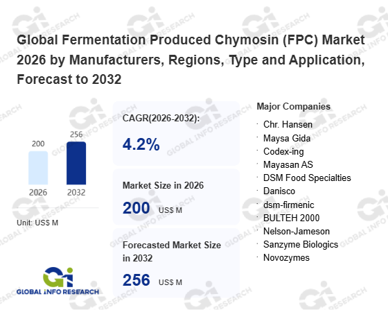 Global Info Research has recently published "Global Fermentation Produced Chymosin (FPC) Market 2026 by Manufacturers, Regions, Type and Application, Forecast to 2032". This report systematically analyzes the global Fermentation Produced Chymosin (FPC) market, providing multi-dimensional insights through type (Liquid Chymosin、 Powdered Chymosin), application (Food、 Pharmaceuticals、 Others), regional markets, and major manufacturers (Chr. Hansen、 Maysa Gida、 Codex-ing、 Mayasan AS、 DSM Food Specialties、 Danisco、 dsm-firmenic、 BULTEH 2000、 Nelson-Jameson、 Sanzyme Biologics、 Novozymes、 Sacco System、 Kerry Group、 Advanced Enzyme Technologies、 Enzyme Development Corporation), assessing the market status, trend evolution, and competitive landscape impact from 2021 to 2032.