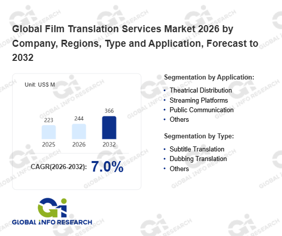 Global Info Research has recently published "Global Film Translation Services Market 2026 by Manufacturers, Regions, Type and Application, Forecast to 2032". This report systematically analyzes the global Film Translation Services market, providing multi-dimensional insights through type (Subtitle Translation、 Dubbing Translation、 Others), application (Theatrical Distribution、 Streaming Platforms、 Public Communication、 Others), regional markets, and major manufacturers (Iyuno、 SDI Media、 ZOO Digital、 Audiomaster Candiani、 Keywords Studios、 Visual Data Media Services、 Dubbing Bros、 Hiventy、 Plint、 Deluxe、 Milestone Localization、 RWS (SDL)、 Espresso Translations、 Lionbridge、 Voquent、 Welocalize、 Global Voices、 LanguageWire、 SeproTec、 Straker Translations), assessing the market status, trend evolution, and competitive landscape impact from 2021 to 2032.