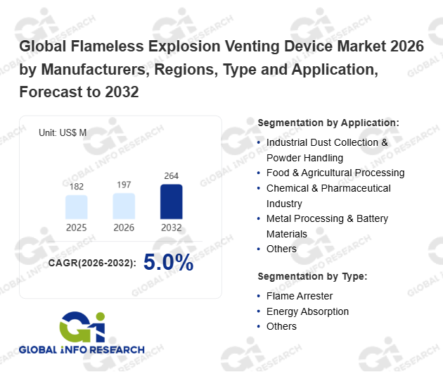 Global Info Research has recently published "Global Flameless Explosion Venting Device Market 2026 by Manufacturers, Regions, Type and Application, Forecast to 2032". This report systematically analyzes the current status, future trends (2021-2032), and competitive landscape of the global Flameless Explosion Venting Device market. It provides a quantitative analysis from the perspectives of type (Flame Arrester、 Energy Absorption、 Others), application (Industrial Dust Collection & Powder Handling、 Food & Agricultural Processing、 Chemical & Pharmaceutical Industry、 Metal Processing & Battery Materials、 Others), regional markets, and major manufacturers (REMBE、 IEP Technologies、 Fike Corporation、 Keller、 STIF、 RSBP spol、 Camfil、 Adix Ingeniería、 StuvEx International、 Boss Products、 CV Technology、 Brilex、 ATEX、 VIGILEX、 BS&B Safety Systems、 VilloTech、 Nederman、 Zhengzhou Zhongtai Anke Powder Technology、 Dingguan Huile Environmental Protection), comprehensively assessing market opportunities and competitive dynamics.