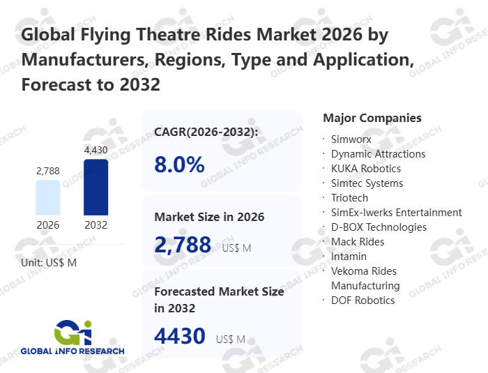 Global Info Research has recently published "Global Flying Theatre Rides Market 2026 by Manufacturers, Regions, Type and Application, Forecast to 2032". This report systematically analyzes the current status, future trends (2021-2032), and competitive landscape of the global Flying Theatre Rides market. It provides a quantitative analysis from the perspectives of type (Low to Medium Capacity、 High Capacity), application (Theme Parks、 Entertainment Venues、 Museums and Science Centers、 Others), regional markets, and major manufacturers (Simworx、 Dynamic Attractions、 KUKA Robotics、 Simtec Systems、 Triotech、 SimEx-Iwerks Entertainment、 D-BOX Technologies、 Mack Rides、 Intamin、 Vekoma Rides Manufacturing、 DOF Robotics、 CAVU、 Huss、 aufwind Group、 Jinma Technology Entertainment、 Brogent Technologies、 Guilin Dinfone Culture Technology), comprehensively assessing market opportunities and competitive dynamics.