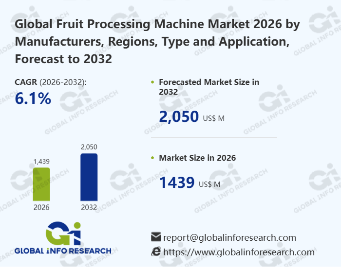 Global Info Research has recently published "Global Fruit Processing Machine Market 2026 by Manufacturers, Regions, Type and Application, Forecast to 2032". This report systematically analyzes the global Fruit Processing Machine market, providing multi-dimensional insights through type (Washing & Cleaning、 Sorting & Grading、 Peeling & Cutting、 Juicing & Pulping、 Drying & Dehydration), application (Fruit Processing Plants、 Juice & Beverage Manufacturers、 Frozen Food Producers、 Agricultural Cooperatives), regional markets, and major manufacturers (ProFruit Machinery、 Bertuzzi Food Processing、 Kronitek、 CFT Group、 Vanmark Equipment、 JBT FoodTech、 ABL S.r.l.、 Alfa Laval、 Sun Engineers、 Goodone、 EquipmentsMachines、 Dinghu District Jowin Electronics Firm、 ZTI、 Robert Bosch GmbH、 Bühler Group、 FTNON (JBT FTNON)、 GEA Group AG、 JBT Corporation、 Krones AG、 Maxwell Chase Technologies、 Meyer Industries、 Scholle Packaging、 Turatti S.r.l.), assessing the market status, trend evolution, and competitive landscape impact from 2021 to 2032.
