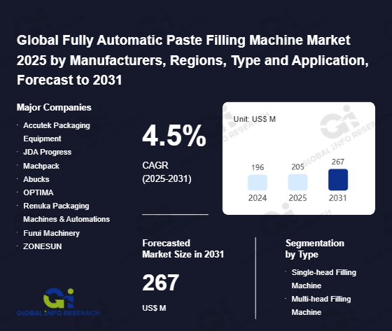 Global Info Research has recently published "Global Fully Automatic Paste Filling Machine Market 2026 by Manufacturers, Regions, Type and Application, Forecast to 2032". This report systematically analyzes the current status, future trends (2021-2032), and competitive landscape of the global Fully Automatic Paste Filling Machine market. It provides a quantitative analysis from the perspectives of type (Single-head Filling Machine、 Multi-head Filling Machine), application (Food、 Pharmaceuticals、 Daily Chemicals、 Others), regional markets, and major manufacturers (Accutek Packaging Equipment、 JDA Progress、 Machpack、 Abucks、 OPTIMA、 Renuka Packaging Machines & Automations、 Furui Machinery、 ZONESUN、 APACKS、 Shanghai Imberson Intelligent Technology Co., Ltd.、 Henan Hengyue Intelligent Technology Co., Ltd.、 Foshan Dession Packaging Machinery Co., Ltd.、 Guangzhou Sina Ekato Chemical Machinery Co., Ltd.), comprehensively assessing market opportunities and competitive dynamics.