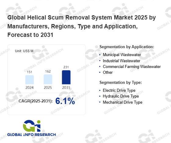 Global Info Research has recently published "Global Helical Scum Removal System Market 2026 by Manufacturers, Regions, Type and Application, Forecast to 2032". This report systematically analyzes the current status, future trends (2021-2032), and competitive landscape of the global Helical Scum Removal System market. It provides a quantitative analysis from the perspectives of type (Electric Drive Type、 Hydraulic Drive Type、 Mechanical Drive Type), application (Municipal Wastewater、 Industrial Wastewater、 Commercial Farming Wastewater、 Other), regional markets, and major manufacturers (Tsurumi Manufacturing Co., Ltd.、 Amwell Inc.、 ABASCO、 Estruagua、 TT Pumps、 Kusters Water、 Jacopa Ltd、 Brentwood Industries, Inc.、 FRC Systems International、 WPL Ltd、 Plasti-Fab、 SONHO PUMP MFG. CO., LTD、 VoR Environmental、 AWE、 Jim Myers & Sons, Inc.、 TecnoConverting Engineering), comprehensively assessing market opportunities and competitive dynamics.