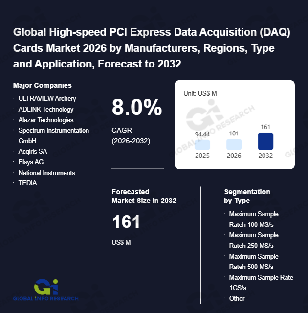 Global Info Research has recently published "Global High-speed PCI Express Data Acquisition (DAQ) Cards Market 2026 by Manufacturers, Regions, Type and Application, Forecast to 2032". This report systematically analyzes the global High-speed PCI Express Data Acquisition (DAQ) Cards market, providing multi-dimensional insights through type (Maximum Sample Rateh 100 MS/s、 Maximum Sample Rateh 250 MS/s、 Maximum Sample Rateh 500 MS/s、 Maximum Sample Rate 1GS/s、 Other), application (Radar/LiDAR、 Ultrasonic/fiber Optic Sensing、 Particle Detection、 Other), regional markets, and major manufacturers (ULTRAVIEW Archery、 ADLINK Technology、 Alazar Technologies、 Spectrum Instrumentation GmbH、 Acqiris SA、 Elsys AG、 National Instruments、 TEDIA、 Axiomtek、 Queentest、 Mysoow、 FCCTEC、 ART、 Wuhan Optical Valley Interlink Technology), assessing the market status, trend evolution, and competitive landscape impact from 2021 to 2032.