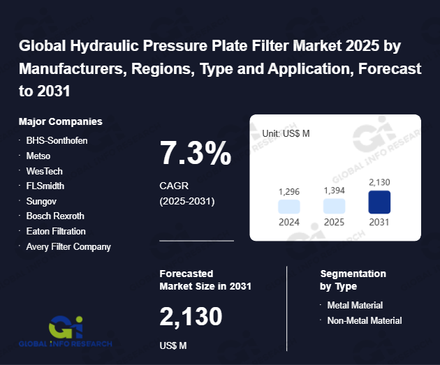 Global Info Research has recently published "Global Hydraulic Pressure Plate Filter Market 2026 by Manufacturers, Regions, Type and Application, Forecast to 2032". This report systematically analyzes the global Hydraulic Pressure Plate Filter market, providing multi-dimensional insights through type (Metal Material、 Non-Metal Material), application (Environmental Protection and Water Treatment、 Chemical and Petroleum、 Food and Beverages、 Pharmaceuticals And Bioengineering、 Others), regional markets, and major manufacturers (BHS-Sonthofen、 Metso、 WesTech、 FLSmidth、 Sungov、 Bosch Rexroth、 Eaton Filtration、 Avery Filter Company、 Peterson Filters、 Durco Filters、 Criveller Group、 Sparkler Fiters、 Roberts Filter Group、 Tonka Water、 Zhongda Bright Filter Press、 Putsch Group、 Eaton Filtration、 HANGZHOU XINGYUAN FILTER TECHNOLOGY), assessing the market status, trend evolution, and competitive landscape impact from 2021 to 2032.