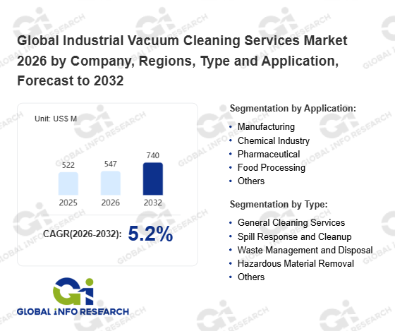 Global Info Research has recently published "Global Industrial Vacuum Cleaning Services Market 2026 by Manufacturers, Regions, Type and Application, Forecast to 2032". This report systematically analyzes the current status, future trends (2021-2032), and competitive landscape of the global Industrial Vacuum Cleaning Services market. It provides a quantitative analysis from the perspectives of type (General Cleaning Services、 Spill Response and Cleanup、 Waste Management and Disposal、 Hazardous Material Removal、 Others), application (Manufacturing、 Chemical Industry、 Pharmaceutical、 Food Processing、 Others), regional markets, and major manufacturers (Clean Harbors、 Thermo Fluids、 Remtech、 Dover Environmental Group、 Vacuum Process Engineering、 Exair Corporation、 Envirovac、 Uni Hygiene、 Saracon, L.P. Industrial Services、 MPW Services、 Industrial Environmental Contracting、 Presvac、 MCF Environmental Services、 HK Solution), comprehensively assessing market opportunities and competitive dynamics.