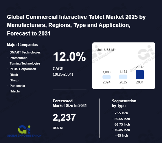 Global Info Research has recently published "Global Commercial Interactive Tablet Market 2026 by Manufacturers, Regions, Type and Application, Forecast to 2032". This report systematically analyzes the current status, future trends (2021-2032), and competitive landscape of the global Commercial Interactive Tablet market. It provides a quantitative analysis from the perspectives of type (< 55 Inch、 56-65 Inch、 66-75 Inch、 76-85 Inch、 > 85 Inch), application (Enterprise、 Education、 Hospital、 Government、 Others), regional markets, and major manufacturers (SMART Technologies、 Promethean、 Turning Technologies、 PLUS Corporation、 Ricoh、 Sharp、 Panasonic、 Hitachi、 Genee、 AOC Monitors、 ViewSonic、 Newline、 Hitevision、 Maxhub、 Changhong、 Returnstar Interactive Technology、 Seewo、 Skyworth、 Horion、 Hisense、 Leyard、 Huawei、 Hikvision、 TCL、 Uniview), comprehensively assessing market opportunities and competitive dynamics.