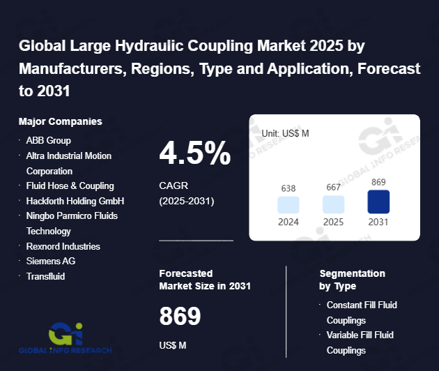 Global Info Research has recently published "Global Large Hydraulic Coupling Market 2026 by Manufacturers, Regions, Type and Application, Forecast to 2032". This report systematically analyzes the global Large Hydraulic Coupling market, providing multi-dimensional insights through type (Constant Fill Fluid Couplings、 Variable Fill Fluid Couplings), application (Oil & Gas、 Chemical、 Metals & Mining、 Power Plants、 Others), regional markets, and major manufacturers (ABB Group、 Altra Industrial Motion Corporation、 Fluid Hose & Coupling、 Hackforth Holding GmbH、 Ningbo Parmicro Fluids Technology、 Rexnord Industries、 Siemens AG、 Transfluid、 Vulkan Drive Tech、 Voith、 Sauer-Danfoss、 Allison Transmission、 Sumitomo Heavy Industries、 Eaton、 Dalian Hydraulic Machinery Co., Ltd.), assessing the market status, trend evolution, and competitive landscape impact from 2021 to 2032.