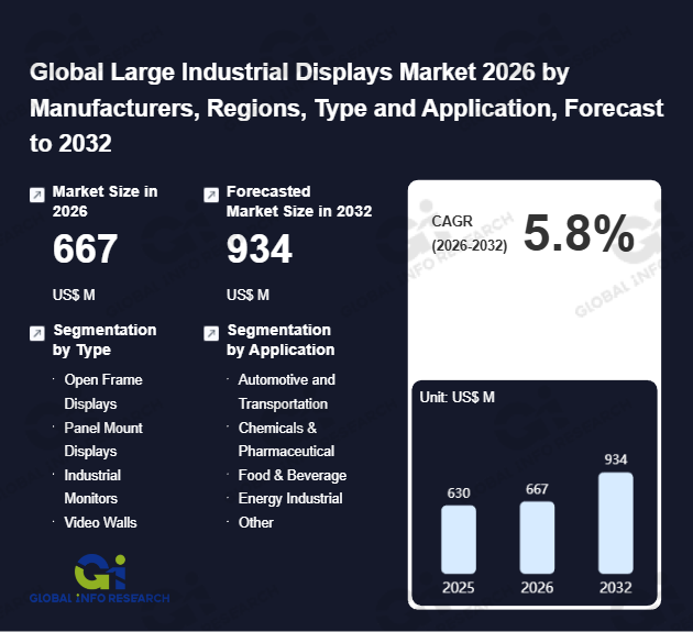 Global Info Research has recently published "Global Large Industrial Displays Market 2026 by Manufacturers, Regions, Type and Application, Forecast to 2032". This report systematically analyzes the global Large Industrial Displays market, providing multi-dimensional insights through type (Open Frame Displays、 Panel Mount Displays、 Industrial Monitors、 Video Walls), application (Automotive and Transportation、 Chemicals & Pharmaceutical、 Food & Beverage、 Energy Industrial、 Other), regional markets, and major manufacturers (Pro-face、 Advantech、 Contec、 AU Optronics、 Siemens、 NEC Display Solutions、 Winmate、 Sparton Corporation、 Kontron、 Daktronics、 Kamal & Co、 Elo Touch Solutions、 IP Displays、 Arista Corporation、 ADLINK Technology、 Beckhoff Automation), assessing the market status, trend evolution, and competitive landscape impact from 2021 to 2032.