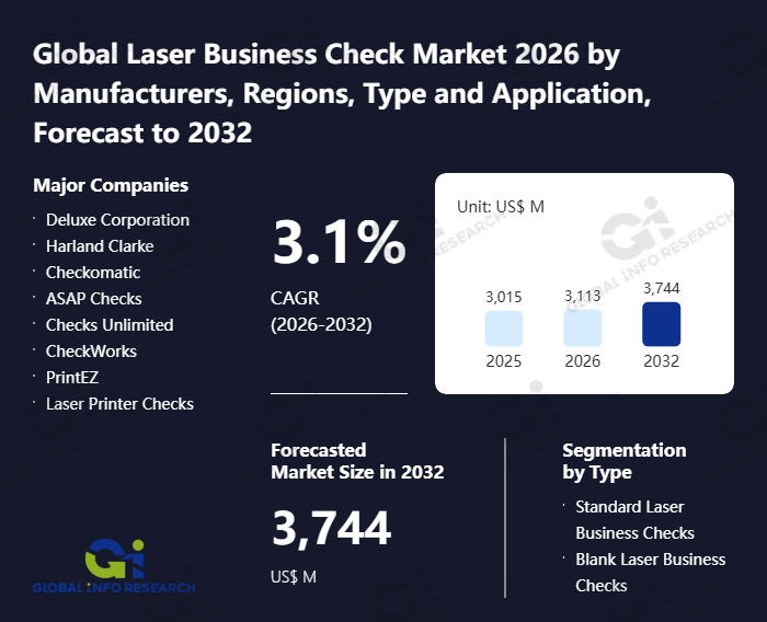 Global Info Research has recently published "Global Laser Business Check Market 2026 by Manufacturers, Regions, Type and Application, Forecast to 2032". This report systematically analyzes the current status, future trends (2021-2032), and competitive landscape of the global Laser Business Check market. It provides a quantitative analysis from the perspectives of type (Standard Laser Business Checks、 Blank Laser Business Checks), application (Large Enterprise、 SMEs), regional markets, and major manufacturers (Deluxe Corporation、 Harland Clarke、 Checkomatic、 ASAP Checks、 Checks Unlimited、 CheckWorks、 PrintEZ、 Laser Printer Checks、 Checks in the Mail、 Safeguard、 VistaPrint、 Bank-A-Count、 Checksforless、 Greatland、 Taylor、 VersaCheck、 Vericast、 Check Depot、 TechChecks), comprehensively assessing market opportunities and competitive dynamics.