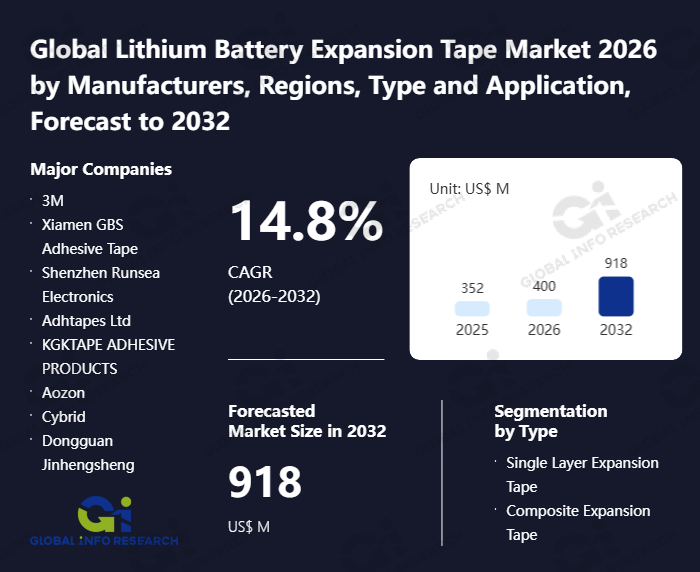 Global Info Research has recently published "Global Lithium Battery Expansion Tape Market 2026 by Manufacturers, Regions, Type and Application, Forecast to 2032". This report systematically analyzes the global Lithium Battery Expansion Tape market, providing multi-dimensional insights through type (Single Layer Expansion Tape、 Composite Expansion Tape), application (Power Battery、 Energy Storage Battery、 Others), regional markets, and major manufacturers (3M、 Xiamen GBS Adhesive Tape、 Shenzhen Runsea Electronics、 Adhtapes Ltd、 KGKTAPE ADHESIVE PRODUCTS、 Aozon、 Cybrid、 Dongguan Jinhengsheng), assessing the market status, trend evolution, and competitive landscape impact from 2021 to 2032.
