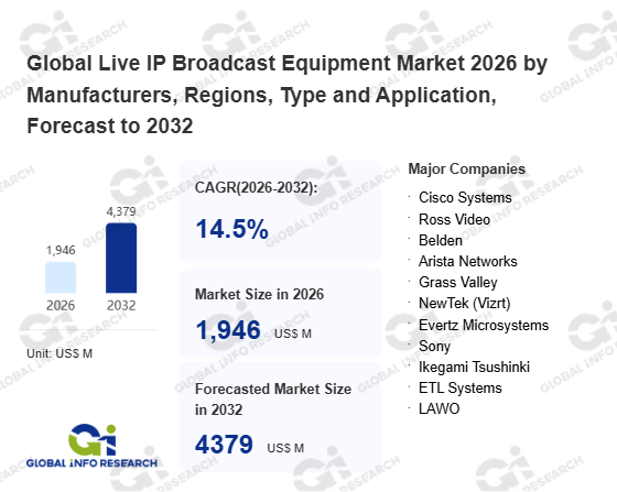 Global Info Research has recently published "Global Live IP Broadcast Equipment Market 2026 by Manufacturers, Regions, Type and Application, Forecast to 2032". This report systematically analyzes the current status, future trends (2021-2032), and competitive landscape of the global Live IP Broadcast Equipment market. It provides a quantitative analysis from the perspectives of type (Broadcast Switcher、 Switches and Servers、 Infrastructure、 Others), application (Broadcast Production Centers、 In-Stadium Broadcast、 Outside Broadcast Vans、 Others), regional markets, and major manufacturers (Cisco Systems、 Ross Video、 Belden、 Arista Networks、 Grass Valley、 NewTek (Vizrt)、 Evertz Microsystems、 Sony、 Ikegami Tsushinki、 ETL Systems、 LAWO、 Imagine Communication、 Harmonic、 Matrox、 Telos Alliance、 Ericsson、 EVS Broadcast Equipment、 TAG Video Systems、 Bejing Gefei Technology Co Ltd、 AJA Video Systems), comprehensively assessing market opportunities and competitive dynamics.