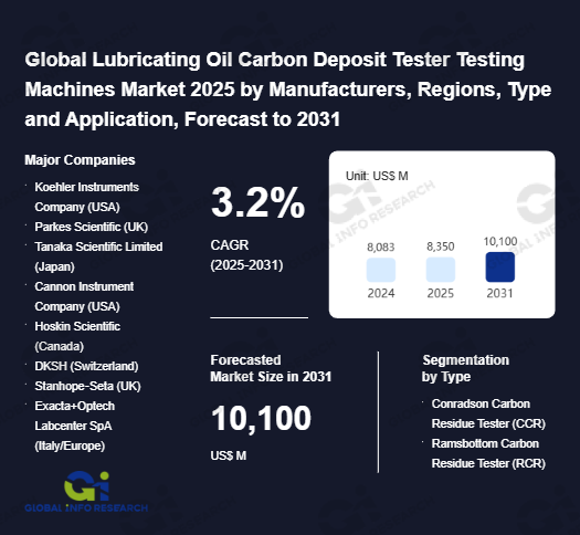 Global Info Research has recently published "Global Lubricating Oil Carbon Deposit Tester Testing Machines Market 2026 by Manufacturers, Regions, Type and Application, Forecast to 2032". This report systematically analyzes the current status, future trends (2021-2032), and competitive landscape of the global Lubricating Oil Carbon Deposit Tester Testing Machines market. It provides a quantitative analysis from the perspectives of type (Conradson Carbon Residue Tester (CCR)、 Ramsbottom Carbon Residue Tester (RCR)), application (Automotive & Transportation、 Aerospace Industry、 Marine & Shipping、 Power & Oil Industry、 Others), regional markets, and major manufacturers (Koehler Instruments Company (USA)、 Parkes Scientific (UK)、 Tanaka Scientific Limited (Japan)、 Cannon Instrument Company (USA)、 Hoskin Scientific (Canada)、 DKSH (Switzerland)、 Stanhope‑Seta (UK)、 Exacta+Optech Labcenter SpA (Italy/Europe)、 Ayalytical (USA)、 Chongqing Gold Mechanical & Electrical Equipment Co., Ltd. (China)、 LABOAO (China)、 KAYCAN INSTRUMENT (Dalian) Co., Ltd. (China)、 Scimed (UK)、 Alcor (PAC lab instruments) (USA)、 Labtron (UK)、 LabEQ uip (USA)), comprehensively assessing market opportunities and competitive dynamics.
