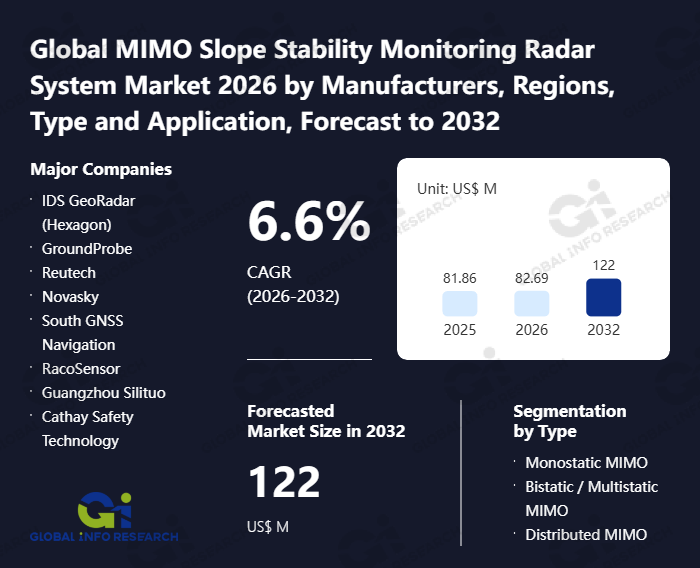 Global Info Research has recently published "Global MIMO Slope Stability Monitoring Radar System Market 2026 by Manufacturers, Regions, Type and Application, Forecast to 2032". This report systematically analyzes the global MIMO Slope Stability Monitoring Radar System market, providing multi-dimensional insights through type (Monostatic MIMO、 Bistatic / Multistatic MIMO、 Distributed MIMO), application (Mining、 Transportation Engineering、 Water Conservancy Engineering、 Others), regional markets, and major manufacturers (IDS GeoRadar (Hexagon)、 GroundProbe、 Reutech、 Novasky、 South GNSS Navigation、 RacoSensor、 Guangzhou Silituo、 Cathay Safety Technology), assessing the market status, trend evolution, and competitive landscape impact from 2021 to 2032.