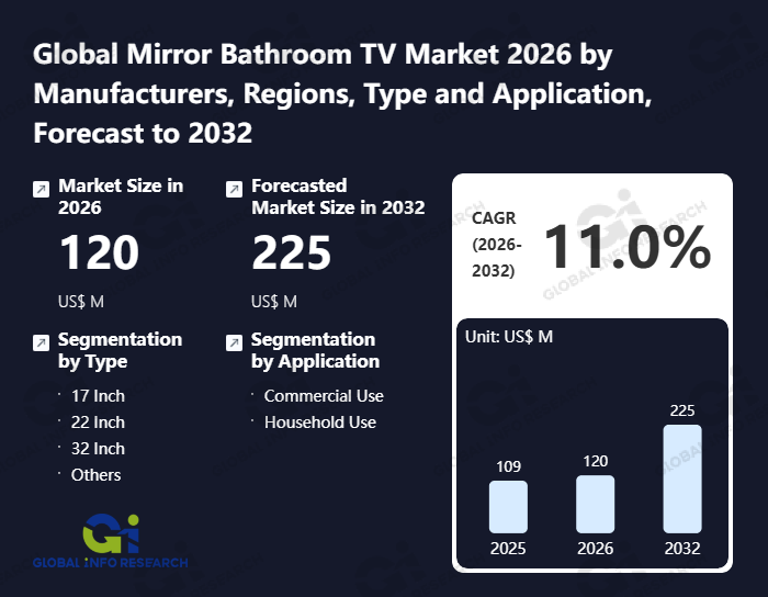 Global Info Research has recently published "Global Mirror Bathroom TV Market 2026 by Manufacturers, Regions, Type and Application, Forecast to 2032". This report systematically analyzes the current status, future trends (2021-2032), and competitive landscape of the global Mirror Bathroom TV market. It provides a quantitative analysis from the perspectives of type (17 Inch、 22 Inch、 32 Inch、 Others), application (Commercial Use、 Household Use), regional markets, and major manufacturers (Sarason TV、 WaterVue、 Evervue、 Luxurite、 CONNKER、 OWATIS、 AVIS Electronics、 Seura、 ProofVision、 Kontech、 Haocrown、 Oolaa、 Aquavision、 TwinBird、 Rinnai、 LIXIL、 TOTO、 Mirarel、 Noritz、 Videotree、 Tech2o、 Xander Prestige、 ad notam、 TechVision AV Limited), comprehensively assessing market opportunities and competitive dynamics.