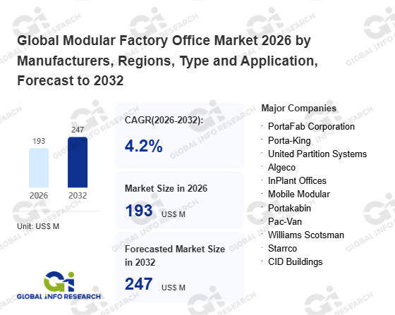 Global Info Research has recently published "Global Modular Factory Office Market 2026 by Manufacturers, Regions, Type and Application, Forecast to 2032". This report systematically analyzes the current status, future trends (2021-2032), and competitive landscape of the global Modular Factory Office market. It provides a quantitative analysis from the perspectives of type (Single Office、 Double Office、 Others), application (Construction、 Industry、 Electronics、 Energy、 Others), regional markets, and major manufacturers (PortaFab Corporation、 Porta-King、 United Partition Systems、 Algeco、 InPlant Offices、 Mobile Modular、 Portakabin、 Pac-Van、 Williams Scotsman、 Starrco、 CID Buildings、 Ebtech、 KABTech、 Panel Built、 Allied Modular), comprehensively assessing market opportunities and competitive dynamics.