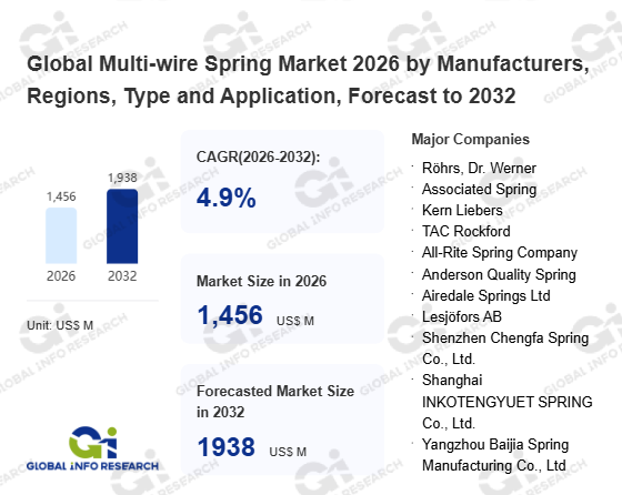 Global Info Research has recently published "Global Multi-wire Spring Market 2026 by Manufacturers, Regions, Type and Application, Forecast to 2032". This report systematically analyzes the global Multi-wire Spring market, providing multi-dimensional insights through type (Compression Type、 Tension Type、 Torsion Type), application (National Defense and Military Industry、 Aerospace、 Rail Transit、 Automotive Industry、 Other), regional markets, and major manufacturers (Röhrs, Dr. Werner、 Associated Spring、 Kern Liebers、 TAC Rockford、 All-Rite Spring Company、 Anderson Quality Spring、 Airedale Springs Ltd、 Lesjöfors AB、 Shenzhen Chengfa Spring Co., Ltd.、 Shanghai INKOTENGYUET SPRING Co., Ltd.、 Yangzhou Baijia Spring Manufacturing Co., Ltd、 Hangzhou Xingfa Spring Co., Ltd.), assessing the market status, trend evolution, and competitive landscape impact from 2021 to 2032.