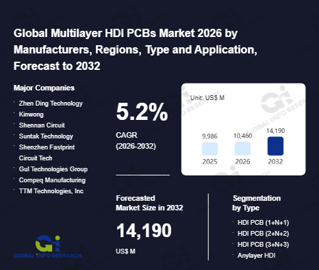 Global Info Research has recently published "Global Multilayer HDI PCBs Market 2026 by Manufacturers, Regions, Type and Application, Forecast to 2032". This report systematically analyzes the current status, future trends (2021-2032), and competitive landscape of the global Multilayer HDI PCBs market. It provides a quantitative analysis from the perspectives of type (HDI PCB (1+N+1)、 HDI PCB (2+N+2)、 HDI PCB (3+N+3)、 Anylayer HDI), application (Consumer Electronics、 Automotive Electronics、 Server & Data Center、 Telecommunications、 Industrial & Medical、 Others), regional markets, and major manufacturers (Zhen Ding Technology、 Kinwong、 Shennan Circuit、 Suntak Technology、 Shenzhen Fastprint Circuit Tech、 Gul Technologies Group、 Compeq Manufacturing、 TTM Technologies, Inc、 Ibiden、 HannStar Board Corporation、 Nan Ya PCB、 Meiko Electronics、 Daeduck Electronics、 Simmtech、 Victory Giant Technology、 AKM Meadville、 CMK Corporation、 Aoshikang Technology、 CHIN POON Industrial、 Olympic Circuit、 Dongguan Shengyi Electronics、 Dynamic Electronics、 Bomin Electronics、 Founder PCB、 TPT、 KCE GROUP、 Shenzhen Sun & Lynn Circuits、 CCTC、 Guangdong Kingshine Electronics、 Sunshine Global Circuits), comprehensively assessing market opportunities and competitive dynamics.