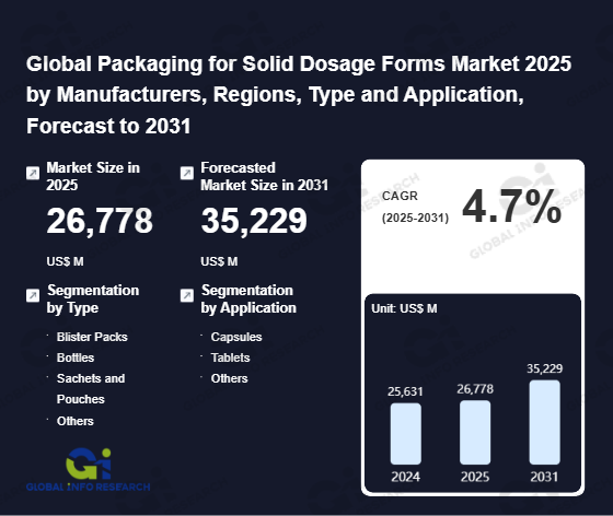 Global Info Research has recently published "Global Packaging for Solid Dosage Forms Market 2026 by Manufacturers, Regions, Type and Application, Forecast to 2032". This report systematically analyzes the global Packaging for Solid Dosage Forms market, providing multi-dimensional insights through type (Blister Packs、 Bottles、 Sachets and Pouches、 Others), application (Capsules、 Tablets、 Others), regional markets, and major manufacturers (Amcor、 ACG Pharmapack、 AptarGroup、 Constantia Flexibles、 Gerresheimer、 Stevanato Group、 West Pharmaceutical Services、 Mitsubishi Chemical、 Sumitomo Bakelite、 Liveo Research、 Klöckner Pentaplast、 Origin Pharma Packaging、 Weener Plastics Group、 Bilcare、 Shriji Polymers、 Pravesha、 Bormioli Pharma、 Jiangsu Zhongjin Matai、 Shandong Huazhilin Pharmaceutical Technology、 Sichuan Hui Li Industry、 Harbin Pengcheng New Materials、 Shandong Ujoin Medical Technology、 Sunkey Packaging、 Hubei Hongyu New Packaging Materials、 Baoli Packaging、 Hangzhou Plastics Industry、 HySum Flexibles、 Jiangsu Fuxin Huakang Packaging Materials、 Zibo Zhongnan Pharmaceutical Packaging Materials、 Jiangxi Chunguang New Materials、 Jiangsu Jincai Technology、 Zhejiang Gongdong Medical Technology、 Shaanxi Boye Plastic、 Shijiazhuang Zhonghui Pharmaceutical Packaging、 Shijiazhuang Xinfuda Medical Packaging、 Xiamen Xinxing Packaging、 Zhejiang Huanuo Pharmaceutical Packaging), assessing the market status, trend evolution, and competitive landscape impact from 2021 to 2032.