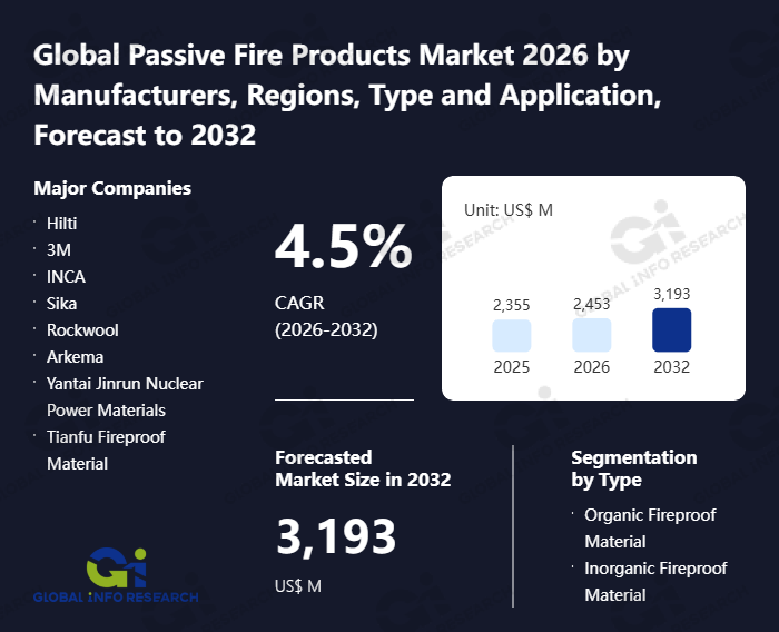Global Info Research has recently published "Global Passive Fire Products Market 2026 by Manufacturers, Regions, Type and Application, Forecast to 2032". This report systematically analyzes the current status, future trends (2021-2032), and competitive landscape of the global Passive Fire Products market. It provides a quantitative analysis from the perspectives of type (Organic Fireproof Material、 Inorganic Fireproof Material), application (Petrochemical、 Electric Power、 Communication、 Commercial Buildings、 Others), regional markets, and major manufacturers (Hilti、 3M、 INCA、 Sika、 Rockwool、 Arkema、 Yantai Jinrun Nuclear Power Materials、 Tianfu Fireproof Material、 Jiangsu Huaxing Fireproof Material、 Hebei Antai Fireproof Material、 Tianjin Anshengda Fireproof Material、 Hebei Junhui Security Technology、 Jiangsu Hailong Nuclear Technology、 Guangzhou Baiyun Chemical Industry、 Shanghai Weineng New Material Technology、 Langfang Ruijian Refractories、 Li'an Fire Equipment、 Tianyuan Warwick Group、 Shenzhen Xisier Fireproof and Insulation Material、 Weicheng Fire Protection Technology), comprehensively assessing market opportunities and competitive dynamics.