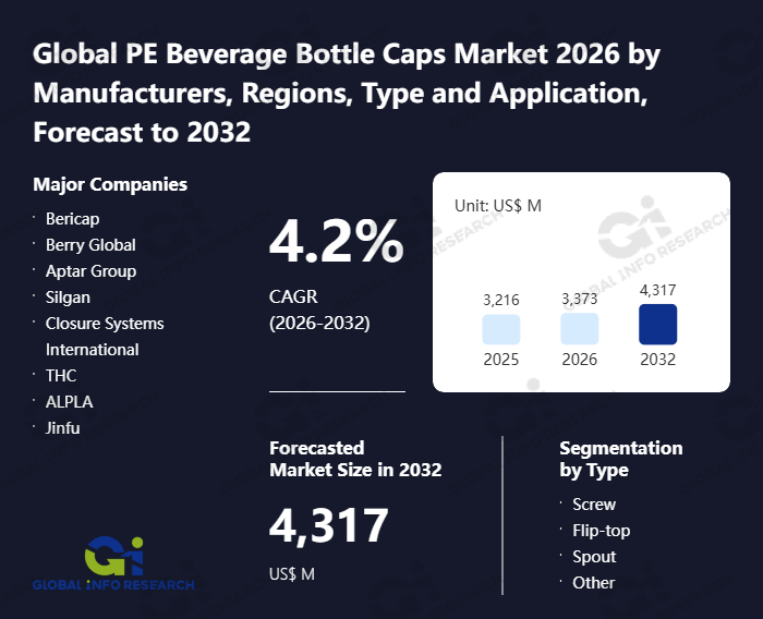 Global Info Research has recently published "Global PE Beverage Bottle Caps Market 2026 by Manufacturers, Regions, Type and Application, Forecast to 2032". This report systematically analyzes the global PE Beverage Bottle Caps market, providing multi-dimensional insights through type (Screw、 Flip-top、 Spout、 Other), application (Water、 Carbonated Drinks、 Juice、 Other), regional markets, and major manufacturers (Bericap、 Berry Global、 Aptar Group、 Silgan、 Closure Systems International、 THC、 ALPLA、 Jinfu、 Mold Rite Plastics、 Oriental Containers、 Zijiang、 Blackhawk Molding、 ZhongFu、 Mocap), assessing the market status, trend evolution, and competitive landscape impact from 2021 to 2032.