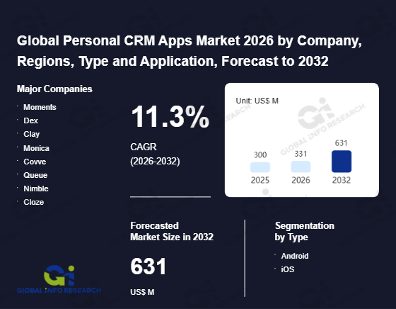 Global Info Research has recently published "Global Personal CRM Apps Market 2026 by Manufacturers, Regions, Type and Application, Forecast to 2032". This report systematically analyzes the global Personal CRM Apps market, providing multi-dimensional insights through type (Android、 iOS), application (Solopreneurs、 Managers、 Reelancers、 Others), regional markets, and major manufacturers (Moments、 Dex、 Clay、 Monica、 Covve、 Queue、 Nimble、 Cloze、 Airtable、 Notion、 Folk、 Garden App、 UpHabit、 Circles、 Nat、 BIGContacts), assessing the market status, trend evolution, and competitive landscape impact from 2021 to 2032.