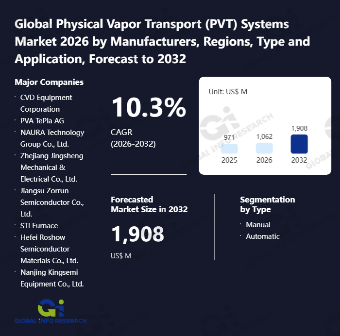 Global Info Research has recently published "Global Physical Vapor Transport (PVT) Systems Market 2026 by Manufacturers, Regions, Type and Application, Forecast to 2032". This report systematically analyzes the global Physical Vapor Transport (PVT) Systems market, providing multi-dimensional insights through type (Manual、 Automatic), application (Semiconductor、 Optoelectronic Devices、 Photovoltaic Materials、 Others), regional markets, and major manufacturers (CVD Equipment Corporation、 PVA TePla AG、 NAURA Technology Group Co., Ltd.、 Zhejiang Jingsheng Mechanical & Electrical Co., Ltd.、 Jiangsu Zorrun Semiconductor Co., Ltd.、 STI Furnace、 Hefei Roshow Semiconductor Materials Co., Ltd.、 Nanjing Kingsemi Equipment Co., Ltd.), assessing the market status, trend evolution, and competitive landscape impact from 2021 to 2032.