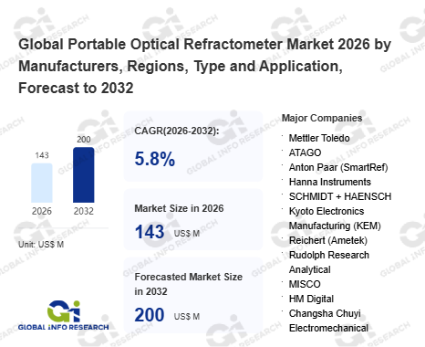 Global Info Research has recently published "Global Portable Optical Refractometer Market 2026 by Manufacturers, Regions, Type and Application, Forecast to 2032". This report systematically analyzes the global Portable Optical Refractometer market, providing multi-dimensional insights through type (Below 60°、 60-80°、 Above 80°), application (Food and Beverage、 Agriculture、 Pharmaceuticals and Chemicals、 Others), regional markets, and major manufacturers (Mettler Toledo、 ATAGO、 Anton Paar (SmartRef)、 Hanna Instruments、 SCHMIDT + HAENSCH、 Kyoto Electronics Manufacturing (KEM)、 Reichert (Ametek)、 Rudolph Research Analytical、 MISCO、 HM Digital、 Changsha Chuyi Electromechanical、 Linghang Lijia Mechanical & Electrical、 Bellingham + Stanley (Xylem Analytics)、 Fisher Scientific (Thermo Fisher Scientific)、 A.KRÜSS Optronic GmbH、 Extech (Teledyne FLIR)、 PCE Instruments、 DeltaTrak、 InsMark、 Three-In-One Enterprises、 Sper Scientific、 REED Instruments、 Takamori-kohki (TKR-1)、 Allafrance、 VEE GEE Scientific、 Milwaukee Instruments、 Shinwa、 Sinotester Biological、 Laxco), assessing the market status, trend evolution, and competitive landscape impact from 2021 to 2032.