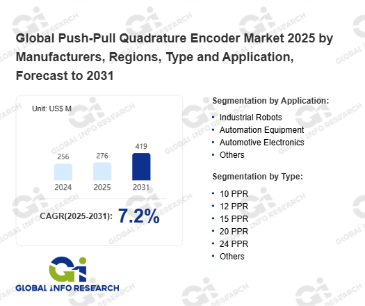 Global Info Research has recently published "Global Push-Pull Quadrature Encoder Market 2026 by Manufacturers, Regions, Type and Application, Forecast to 2032". This report systematically analyzes the current status, future trends (2021-2032), and competitive landscape of the global Push-Pull Quadrature Encoder market. It provides a quantitative analysis from the perspectives of type (10 PPR、 12 PPR、 15 PPR、 20 PPR、 24 PPR、 Others), application (Industrial Robots、 Automation Equipment、 Automotive Electronics、 Others), regional markets, and major manufacturers (Dynapar、 Sparkfun、 TE Connectivity、 Same Sky、 Bourns、 Broadcom、 Rotalink、 Omron、 Grayhill、 Nidec Components、 Panasonic、 Sensata、 TT Electronics、 WURTH ELEKTRONIK、 ELAP、 US Digital、 JTEKT、 Joral), comprehensively assessing market opportunities and competitive dynamics.