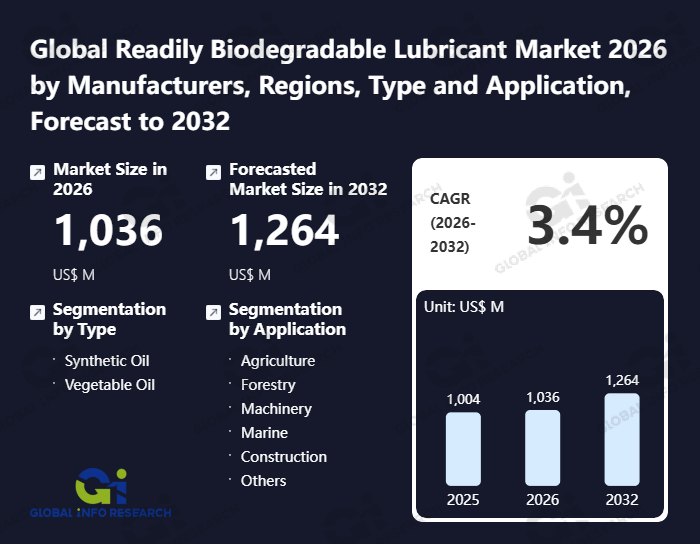 Global Info Research has recently published "Global Readily Biodegradable Lubricant Market 2026 by Manufacturers, Regions, Type and Application, Forecast to 2032". This report systematically analyzes the current status, future trends (2021-2032), and competitive landscape of the global Readily Biodegradable Lubricant market. It provides a quantitative analysis from the perspectives of type (Synthetic Oil、 Vegetable Oil), application (Agriculture、 Forestry、 Machinery、 Marine、 Construction、 Others), regional markets, and major manufacturers (Fuchs、 Shell、 ExxonMobil、 TotalEnergies、 BP、 Chevron、 Valvoline、 Environmental Lubricants Manufacturing、 CONDAT、 Quaker Houghton、 RSC Bio Solutions、 Interlube、 Renewable Lubricants), comprehensively assessing market opportunities and competitive dynamics.