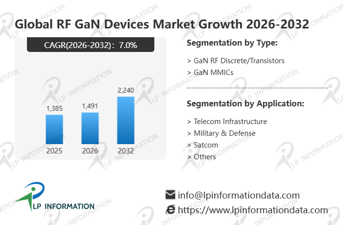 The global RF GaN Devices market size is predicted to grow from US$ 1385 million in 2025 to US$ 2240 million in 2032; it is expected to grow at a CAGR of 7.0% from 2026 to 2032.