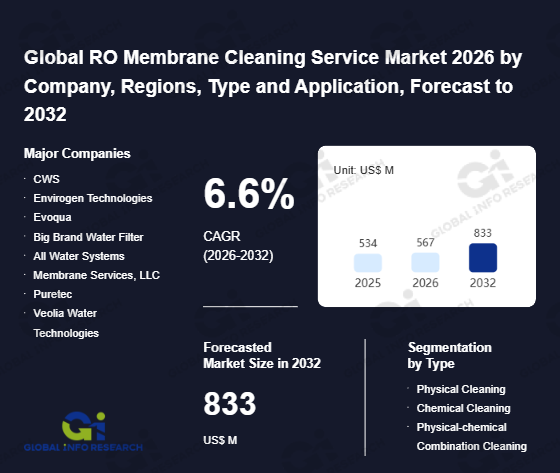 Global Info Research has recently published "Global RO Membrane Cleaning Service Market 2026 by Manufacturers, Regions, Type and Application, Forecast to 2032". This report systematically analyzes the current status, future trends (2021-2032), and competitive landscape of the global RO Membrane Cleaning Service market. It provides a quantitative analysis from the perspectives of type (Physical Cleaning、 Chemical Cleaning、 Physical-chemical Combination Cleaning), application (Water Treatment Plants、 Electronics、 Pharmaceutical、 Other), regional markets, and major manufacturers (CWS、 Envirogen Technologies、 Evoqua、 Big Brand Water Filter、 All Water Systems、 Membrane Services, LLC、 Puretec、 Veolia Water Technologies、 SUEZ Water Technologies & Solutions、 Ecolab、 Dow Water & Process Solutions、 Pall Corporation、 Hydranautics、 Koch Membrane Systems、 Toray Industries、 Lanxess、 Pentair、 PWT Chemicals、 Evoque Water Technologies、 Hebei Quanke Environmental Technology、 Solenis), comprehensively assessing market opportunities and competitive dynamics.