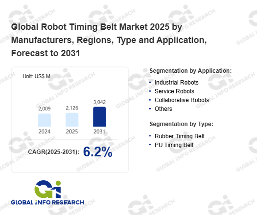 Global Info Research has recently published "Global Robot Timing Belt Market 2026 by Manufacturers, Regions, Type and Application, Forecast to 2032". This report systematically analyzes the current status, future trends (2021-2032), and competitive landscape of the global Robot Timing Belt market. It provides a quantitative analysis from the perspectives of type (Rubber Timing Belt、 PU Timing Belt), application (Industrial Robots、 Service Robots、 Collaborative Robots、 Others), regional markets, and major manufacturers (Gates、 Continental、 Tsubakimoto、 Forbo Group、 Hutchinson、 Mitsuboshi、 Timken、 Habasit、 Megadyne、 B&B Manufacturing、 BRECOflex、 TransDev、 Guangzhou Yonghang Transmission Belt Co., Ltd、 JOMO), comprehensively assessing market opportunities and competitive dynamics.