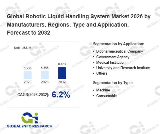 Global Info Research has recently published "Global Robotic Liquid Handling System Market 2026 by Manufacturers, Regions, Type and Application, Forecast to 2032". This report systematically analyzes the global Robotic Liquid Handling System market, providing multi-dimensional insights through type (Machine、 Consumable), application (Biopharmaceutical Company、 Government Agency、 Medical Institution、 University and Research Institute、 Others), regional markets, and major manufacturers (Eppendorf、 Thermo Fisher Scientific、 PerkinElmer、 Agilent、 Labcyte、 Tecan、 Corning、 Aurora Biomed、 Analytik Jena、 BRAND GMBH、 Hudson Robotics、 BICO、 Revvity、 Beckman Coulter、 Hamilton、 Formulatrix、 SPT Labtech、 Tiangen Biotech (Beijing)、 Beijing AMTK Technology Development、 Ashmar Scientific (Shanghai)、 Nanjing Vazyme Biotech、 Suzhou PRCXI Biotechnology、 NAYO Biotechnology (Shanghai)), assessing the market status, trend evolution, and competitive landscape impact from 2021 to 2032.