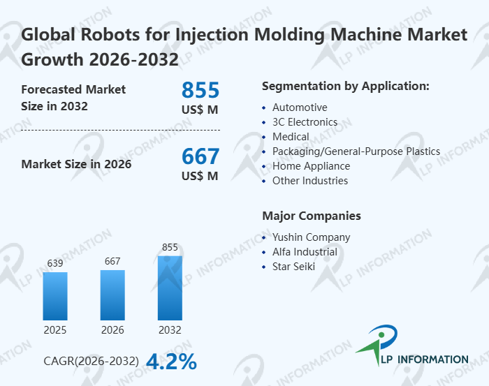 The global Robots for Injection Molding Machine market size is predicted to grow from US$ 639 million in 2025 to US$ 855 million in 2032; it is expected to grow at a CAGR of 4.2% from 2026 to 2032.