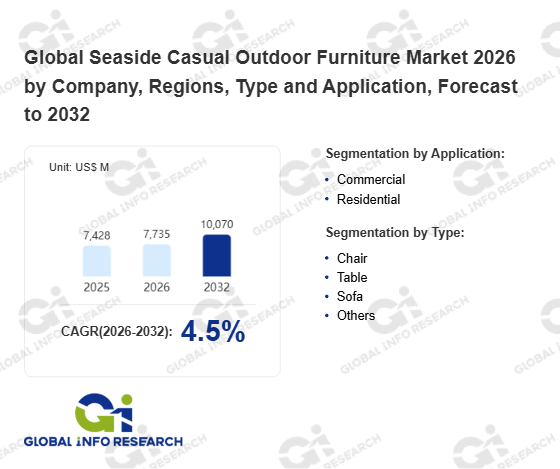 Global Info Research has recently published "Global Seaside Casual Outdoor Furniture Market 2026 by Manufacturers, Regions, Type and Application, Forecast to 2032". This report systematically analyzes the current status, future trends (2021-2032), and competitive landscape of the global Seaside Casual Outdoor Furniture market. It provides a quantitative analysis from the perspectives of type (Chair、 Table、 Sofa、 Others), application (Commercial、 Residential), regional markets, and major manufacturers (Seaside Casual Furniture、 Arctic Marine Furniture as、 Beurteaux、 FAMOS , Ship Furniture Factory、 INEXA A/S、 JB Marine、 Mar Quipt、 Maritime Møbler AS、 Metalika D.O.O.、 Nidaplast、 Staco Europe BV、 YACHTLITE、 Houzz、 Rowe Furniture、 April Furniture), comprehensively assessing market opportunities and competitive dynamics.
