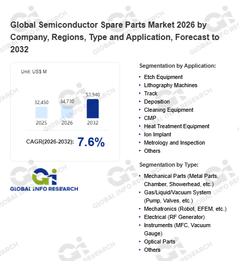 Global Info Research has recently published "Global Semiconductor Spare Parts Market 2026 by Manufacturers, Regions, Type and Application, Forecast to 2032". This report systematically analyzes the global Semiconductor Spare Parts market, providing multi-dimensional insights through type (Mechanical Parts (Metal Parts, Chamber, Showerhead, etc.)、 Gas/Liquid/Vacuum System (Pump, Valves, etc.)、 Mechatronics (Robot, EFEM, etc.)、 Electrical (RF Generator)、 Instruments (MFC, Vacuum Gauge)、 Optical Parts、 Others), application (Etch Equipment、 Lithography Machines、 Track、 Deposition、 Cleaning Equipment、 CMP、 Heat Treatment Equipment、 Ion Implant、 Metrology and Inspection、 Others), regional markets, and major manufacturers (ZEISS、 MKS Instruments、 Atlas Copco (Leybold, and Edwards Vacuum)、 NGK Insulators、 Applied Materials, Inc. (AMAT)、 Lam Research、 Advanced Energy、 HORIBA、 VAT Vakuumventile、 Entegris、 Ichor Systems、 Ultra Clean Holdings Inc. (UCT)、 ASML、 Pall、 Camfil、 Ebara Corporation、 SHINKO、 TOTO Advanced Ceramics、 Kyocera、 Ferrotec、 Schunk Xycarb Technology、 MiCo Ceramics Co., Ltd.、 Morgan Advanced Materials、 Niterra Co., Ltd.、 Coorstek、 Fujikin、 Parker、 CKD Corporation、 Shin-Etsu Polymer、 Foxsemicon Integrated Technology、 KITZ SCT、 Swagelok、 GEMÜ、 Nippon Seisen、 SMC Corporation、 XP Power (Comdel)、 Trumpf、 RORZE Corporation、 Kawasaki Robotics、 DAIHEN Corporation、 Hirata Corporation、 Yaskawa、 Pfeiffer Vacuum GmbH、 LOT Vacuum、 GST (Global Standarard Technology)、 Unisem、 CSK、 JEL Corporation、 Advanced Thermal Sciences Corporation (ATS)、 Shinwa Controls), assessing the market status, trend evolution, and competitive landscape impact from 2021 to 2032.