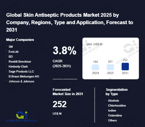 Global Info Research has recently published "Global Skin Antiseptic Products Market 2026 by Manufacturers, Regions, Type and Application, Forecast to 2032". This report systematically analyzes the global Skin Antiseptic Products market, providing multi-dimensional insights through type (Alcohols、 Chlorhexidine、 Iodine、 Octenidine、 Others), application (Surgeries、 Injections), regional markets, and major manufacturers (3M、 EcoLab、 BD、 Reckitt Benckiser、 Kimberly-Clark、 Sage Products LLC、 B.Braun Melsungen AG、 Johnson & Johnson、 Schulke & Mayr GmbH、 Walgreen Co.、 CVS Health、 Mölnlycke Health Care、 MPM Medical, Inc.、 Purdue Pharma L.P.、 Lagaay International), assessing the market status, trend evolution, and competitive landscape impact from 2021 to 2032.