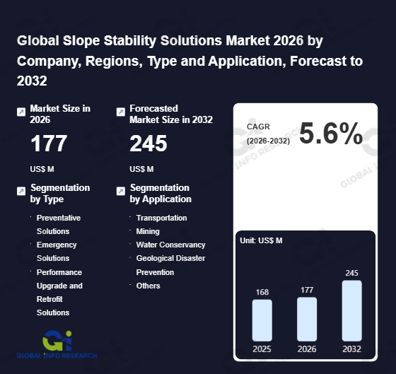 Global Info Research has recently published "Global Slope Stability Solutions Market 2026 by Manufacturers, Regions, Type and Application, Forecast to 2032". This report systematically analyzes the global Slope Stability Solutions market, providing multi-dimensional insights through type (Preventative Solutions、 Emergency Solutions、 Performance Upgrade and Retrofit Solutions), application (Transportation、 Mining、 Water Conservancy、 Geological Disaster Prevention、 Others), regional markets, and major manufacturers (Geoquest、 Tonkin + Taylor、 Keller North America、 Ameritech Slope Constructors、 GRM Development Solutions、 ComNavTech、 Tensar、 Itasca、 Reutech Mining、 MKB Company、 Hexagon、 METER Group、 PGATECH), assessing the market status, trend evolution, and competitive landscape impact from 2021 to 2032.