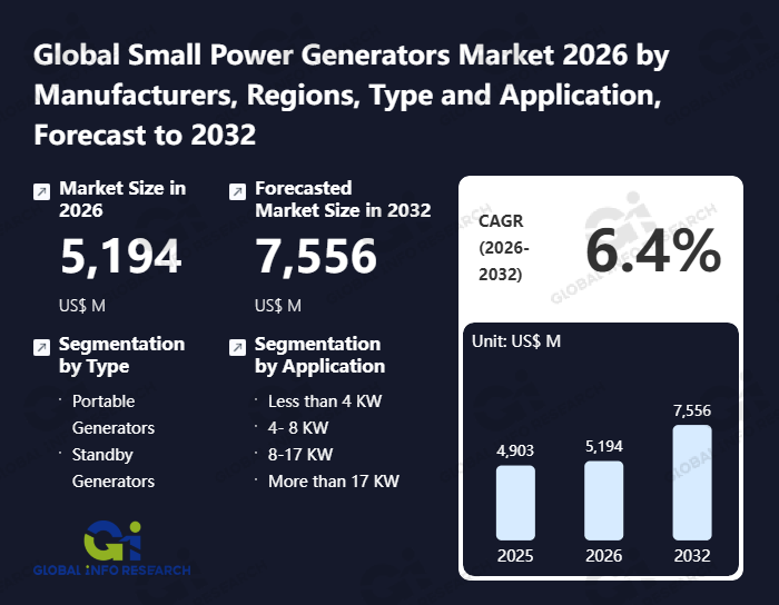 Global Info Research has recently published "Global Small Power Generators Market 2026 by Manufacturers, Regions, Type and Application, Forecast to 2032". This report systematically analyzes the global Small Power Generators market, providing multi-dimensional insights through type (Portable Generators、 Standby Generators), application (Less than 4 KW、 4- 8 KW、 8-17 KW、 More than 17 KW), regional markets, and major manufacturers (Generac、 Honda Power、 Briggs and Stratton、 KOHLER、 Champion、 Yamaha、 TTI、 United Power Technology、 Cummins Power Systems、 Eaton、 Wacker Neuson、 Honeywell、 Hyundai Power、 Sawafuji、 Scott's、 Pramac、 HGI、 Mi-T-M), assessing the market status, trend evolution, and competitive landscape impact from 2021 to 2032.